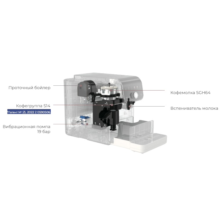 В основе качества напитков от Jetinno JL05 лежат профессиональные инженерные решения. Процесс начинается с кофемолки Jetinno SGH64, оснащенной плоскими стальными жерновами диаметром 64 мм. Она предлагает 9 степеней помола, обеспечивая быстрый (4,2 г/сек) и равномерный помол без перегрева зерен. Полученный кофе поступает в запатентованную кофегруппу S14 с металлической камерой, которая вмещает до 14 грамм кофе и поддерживает технологию предварительного смачивания (pre-infusion) для полного раскрытия аромата. Экстракция проходит под оптимальным давлением 19 бар, создаваемым вибрационной помпой. Проточный бойлер мощностью 1300 Вт гарантирует стабильно высокую температуру для каждой порции, обеспечивая насыщенный и сбалансированный вкус, как у опытного бариста.